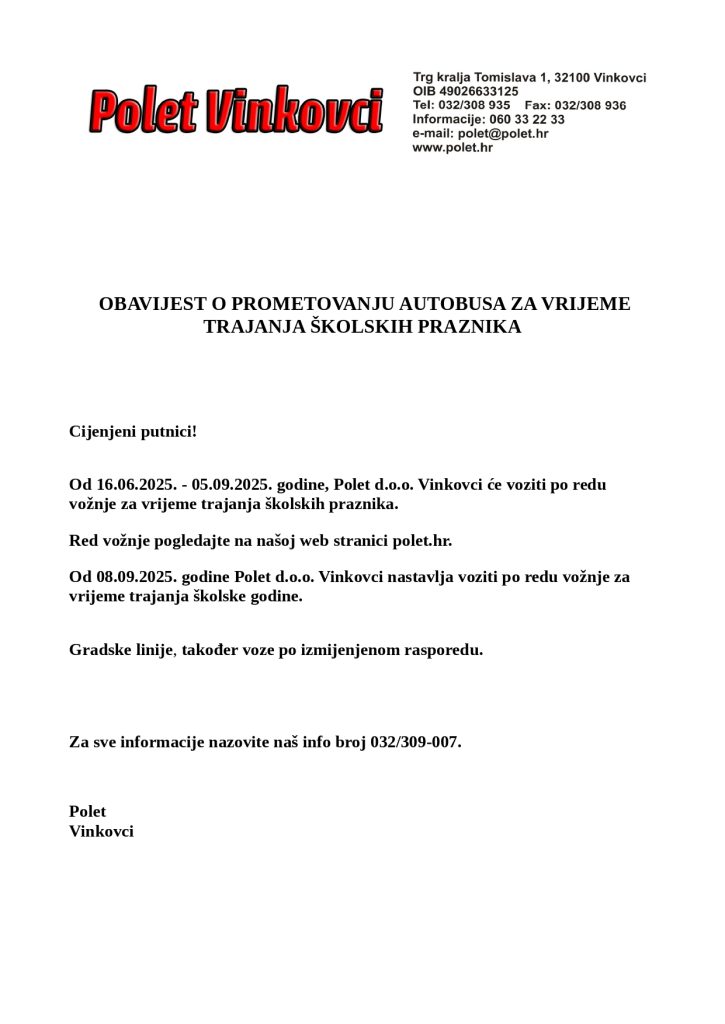 OBAVIJEST O PROMETOVANJU AUTOBUSA ZA VRIJEME TRAJANJA ŠKOLSKIH PRAZNIKA !!