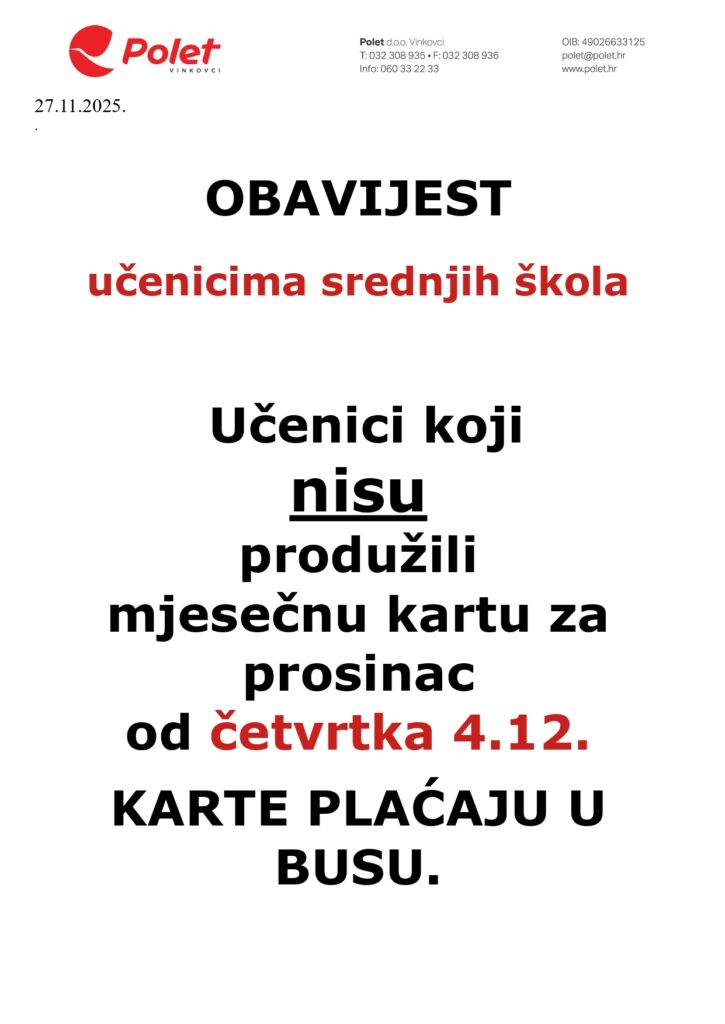OBAVIJEST UČENICIMA SREDNJIH ŠKOLA!!